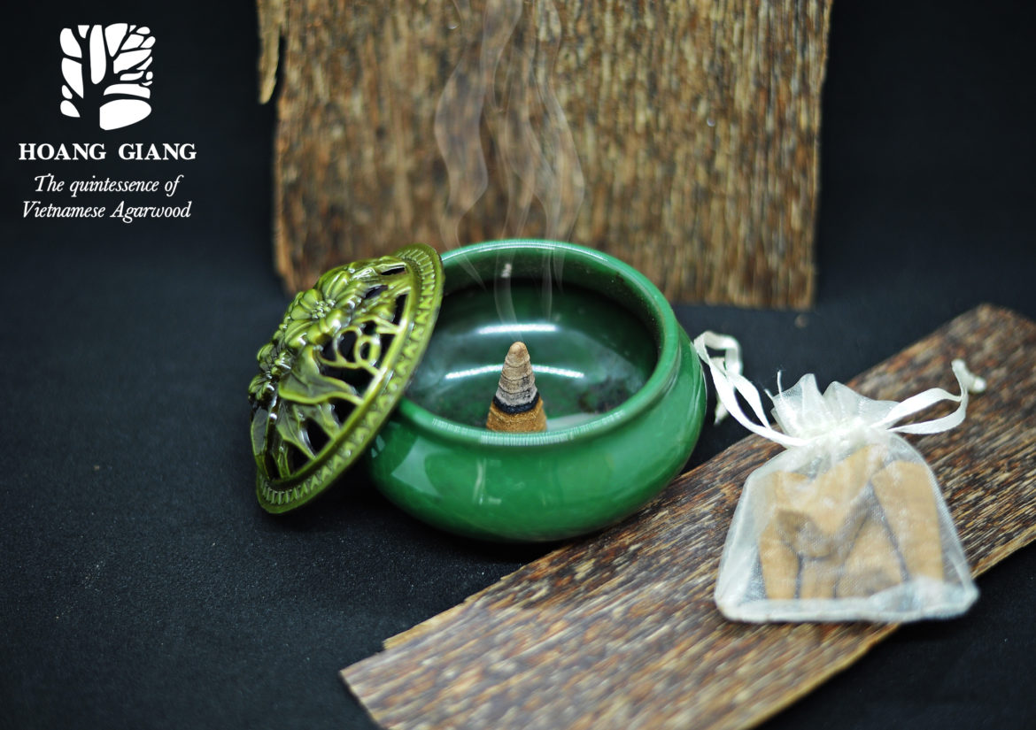 - Agarwood cone of Hoang Giang has 02 type which is normal (30% pure Agarwood powder, 70% post-distilled Agarwood powder) and premium (100% pure Agarwood powder). To steaming Agarwood cone, we need a ceramic plate or a waterfall backflow incense burner. Because of the characteristic of heavier-than-air clouds of white smoke of Agarwood, when being burned on the necessary, Agarwood cone would become a fengshui item with a magnificent vague beauty.