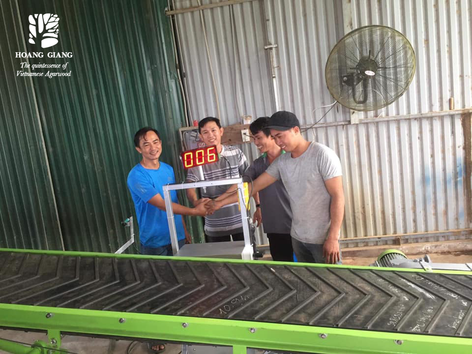 Hoang Giang Agarwood’s technical team was finally able to build a mobile conveyor belt, which is capable of height lifting and lowering, speed adjusting, direction reversing, automatical bag-number counting; no need to buy from outside producers.